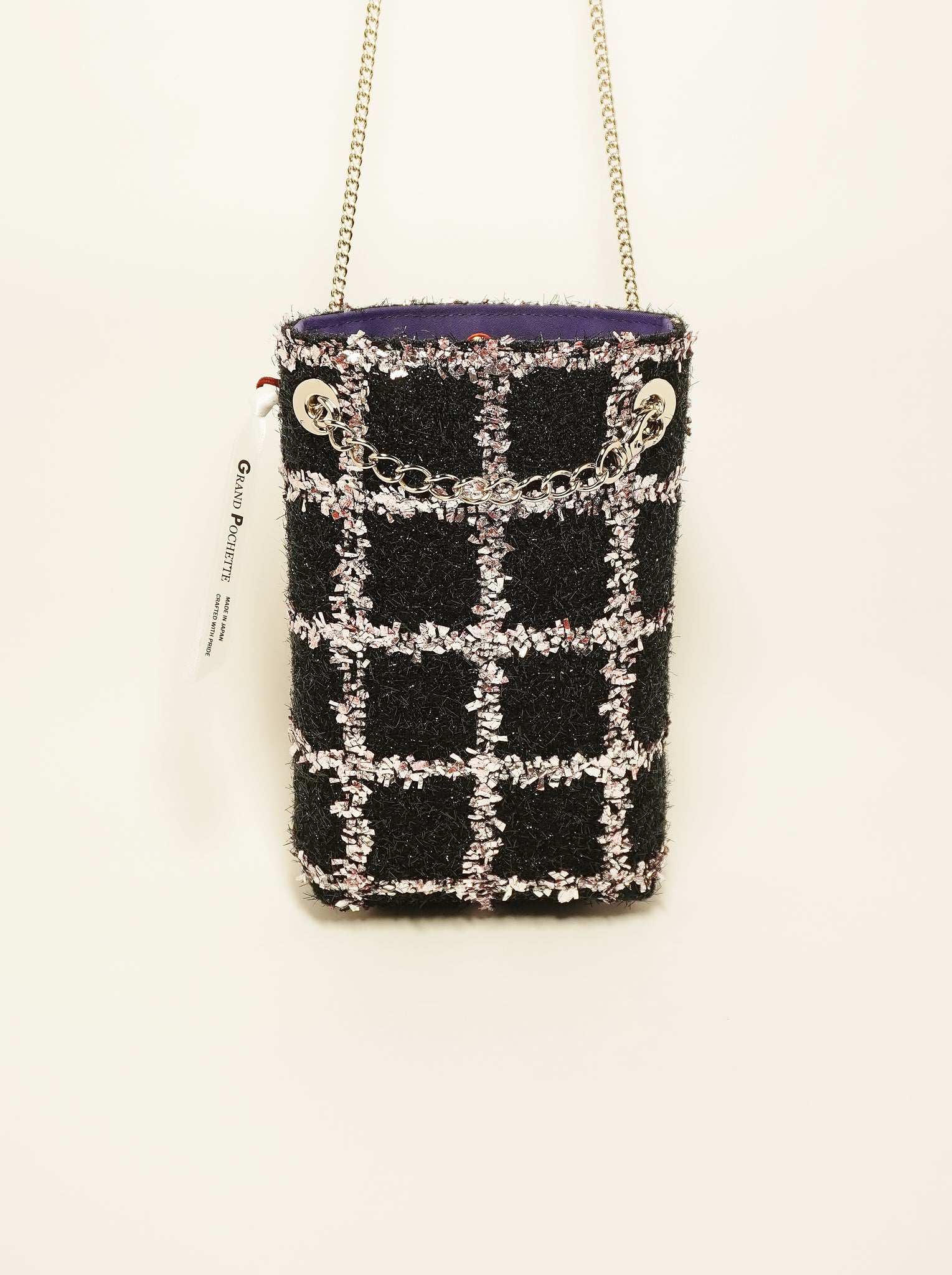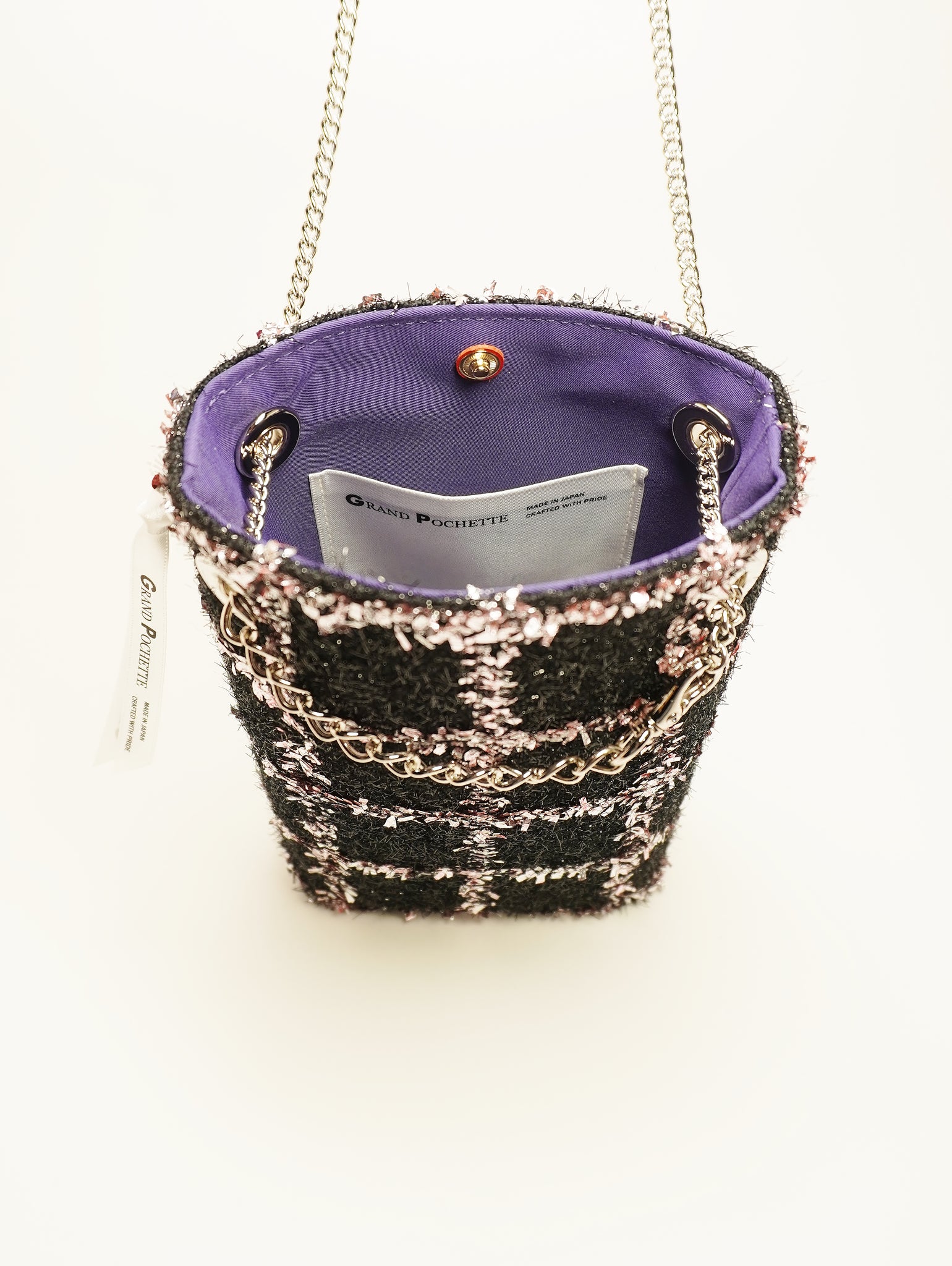 キラキラのメタリックブラックをベースに、ピンクシルバーの大胆な格子柄が映える、ゴージャスな「シャネル・ツイード」のグラン・ポシェット