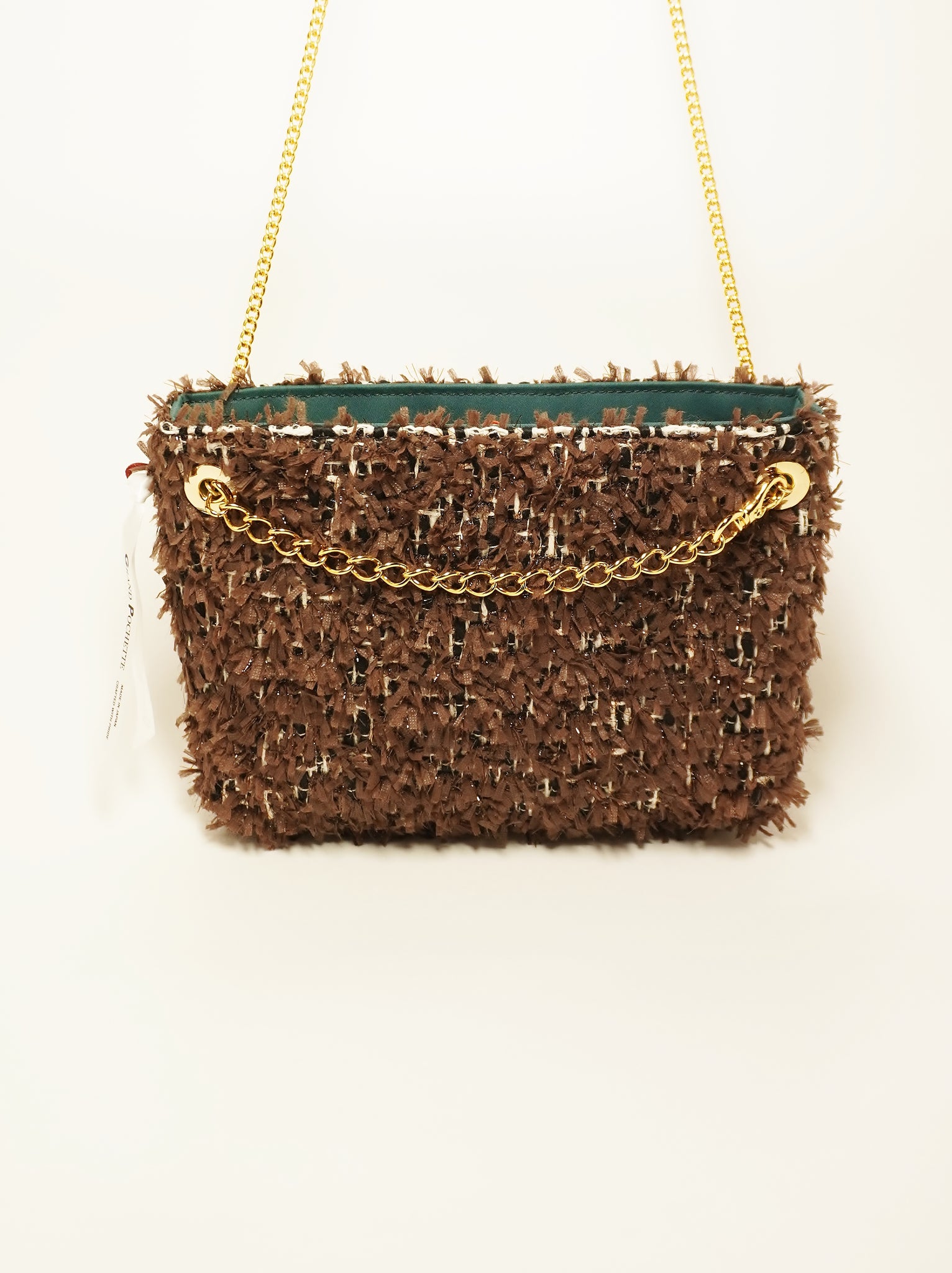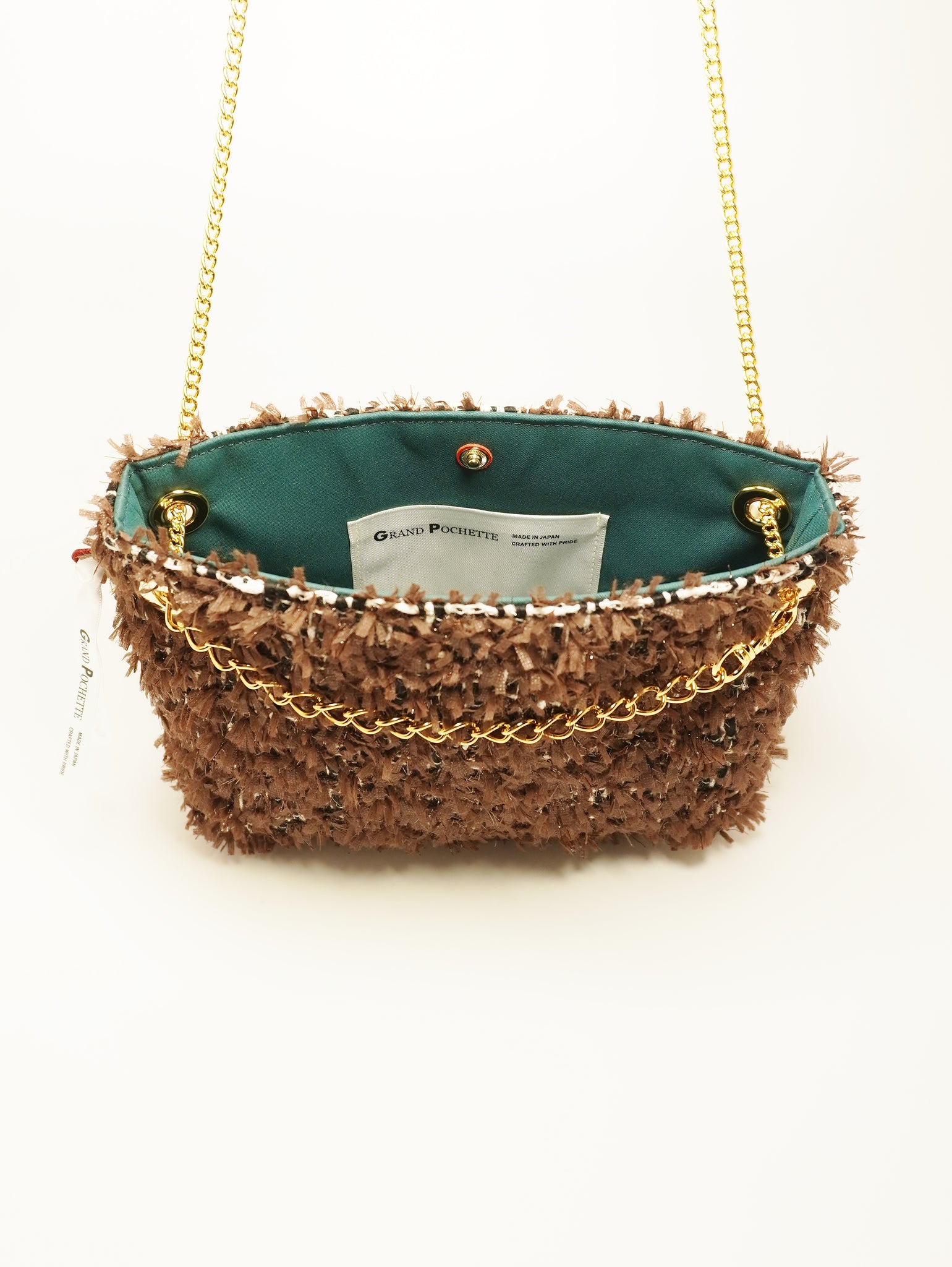 テディベアのような、ふさふさしたブラウンのリボンヤーンがキュート!ちょっぴり個性的な「シャネル・ツイード」のグラン・ポシェット