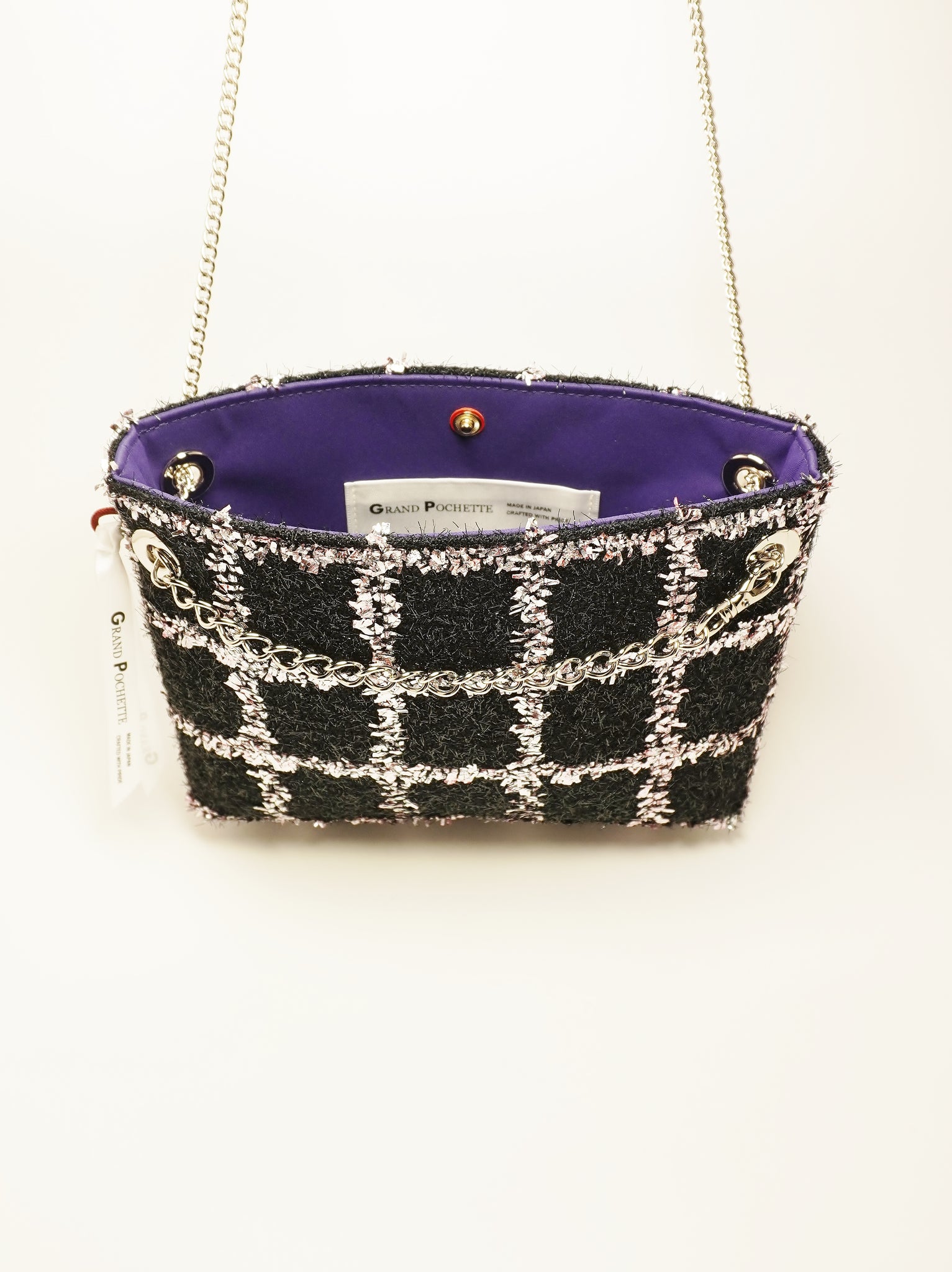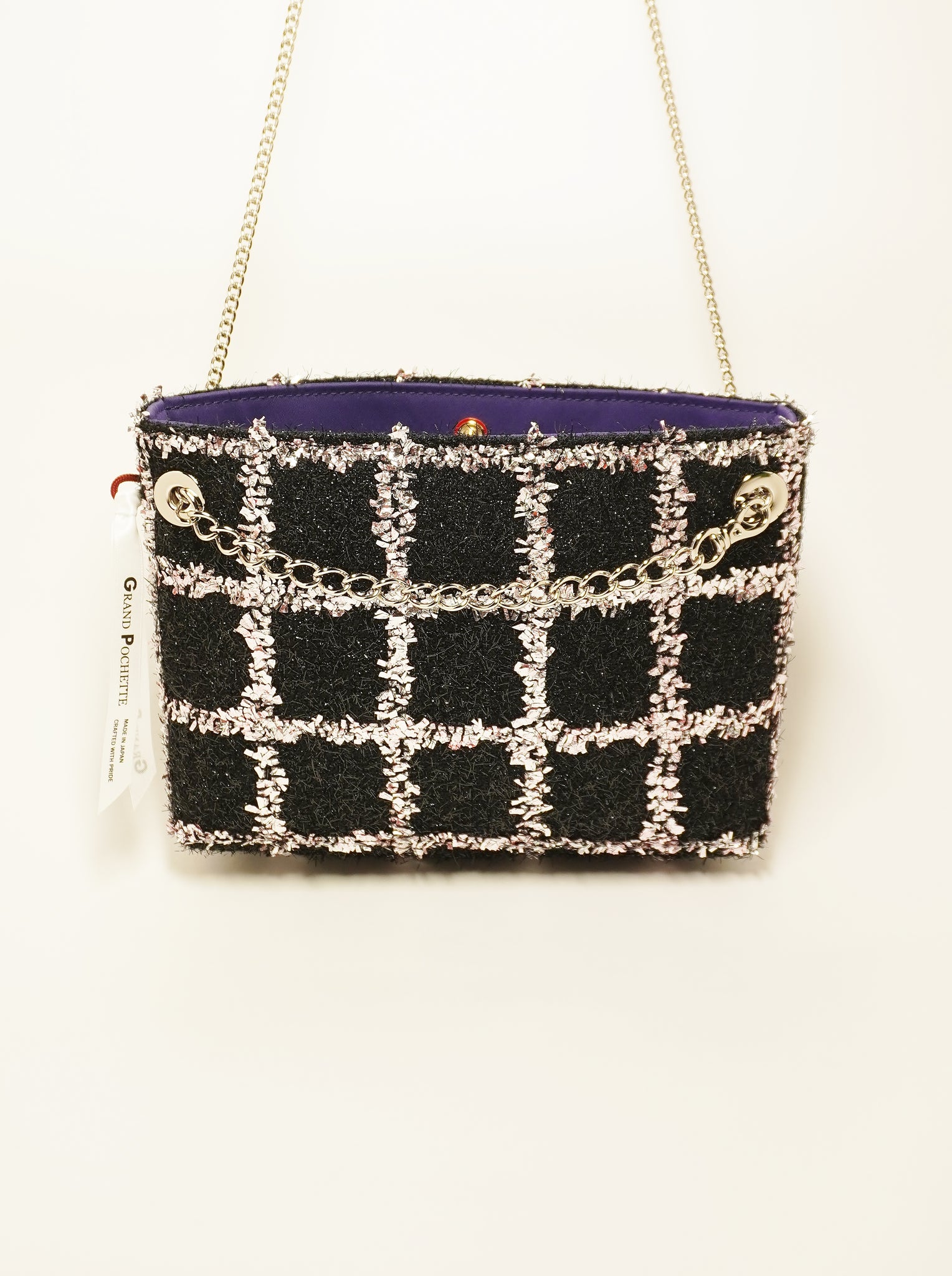 キラキラのメタリックブラックをベースに、ピンクシルバーの大胆な格子柄が映える、ゴージャスな「シャネル・ツイード」のグラン・ポシェット