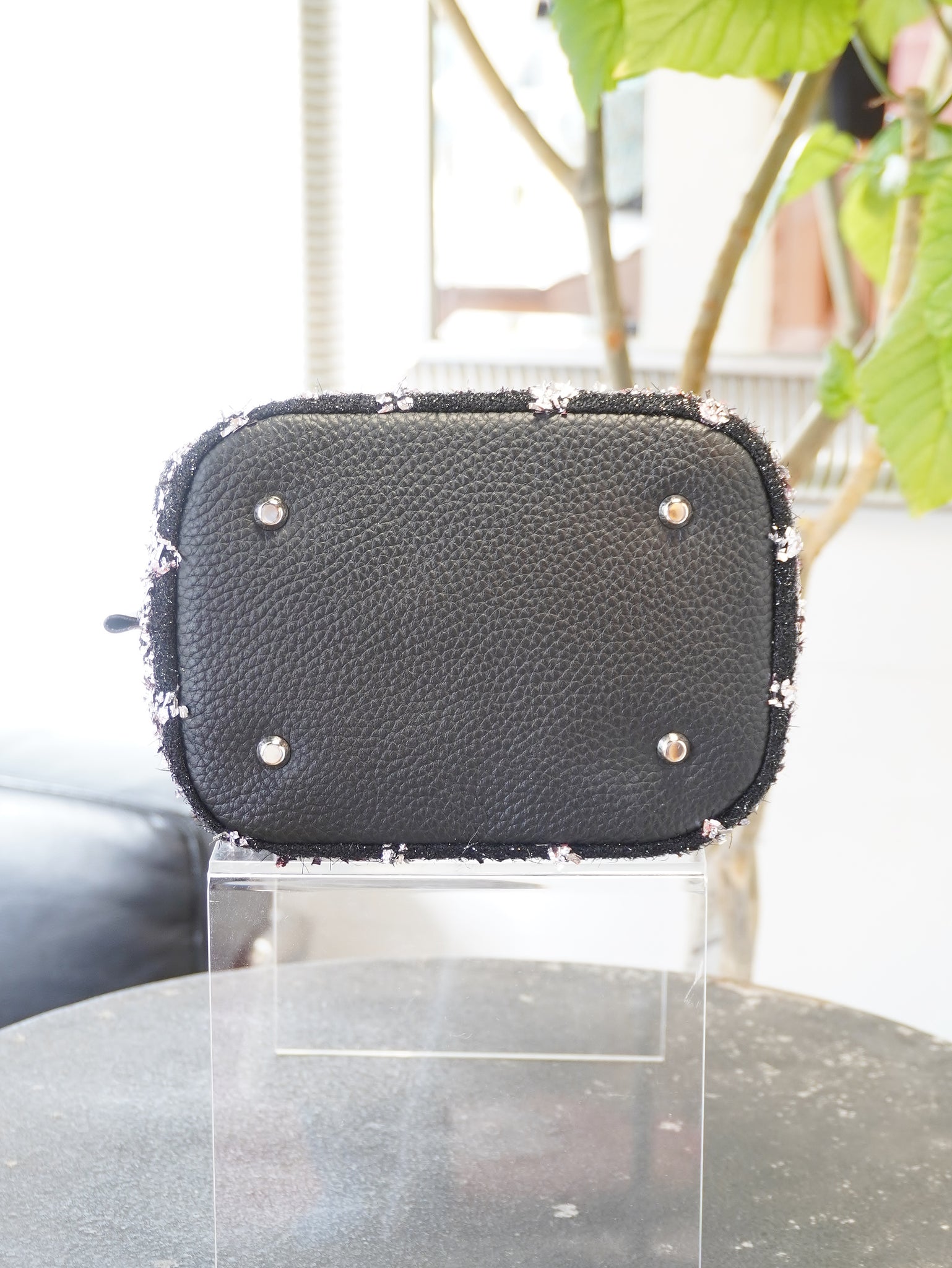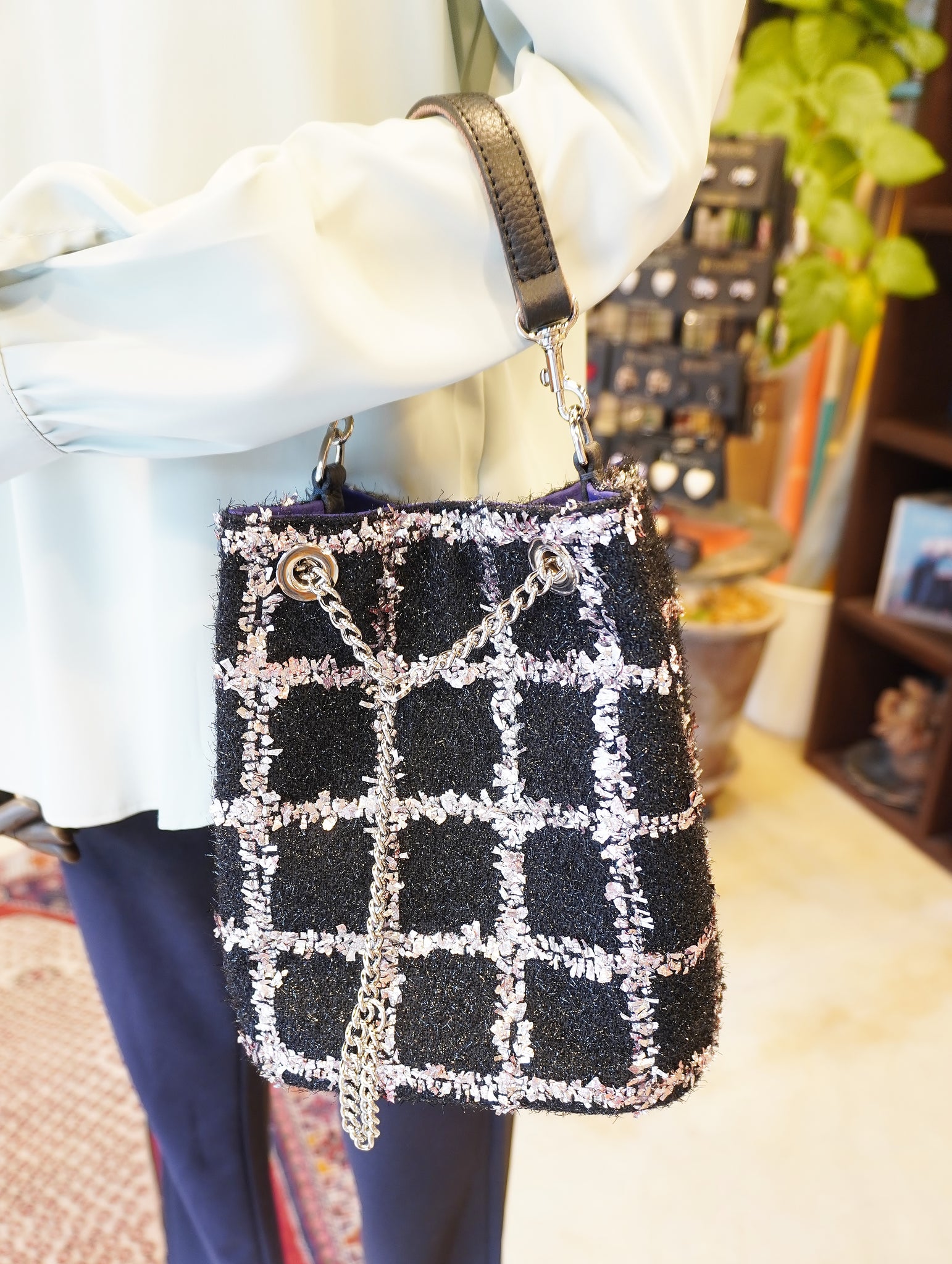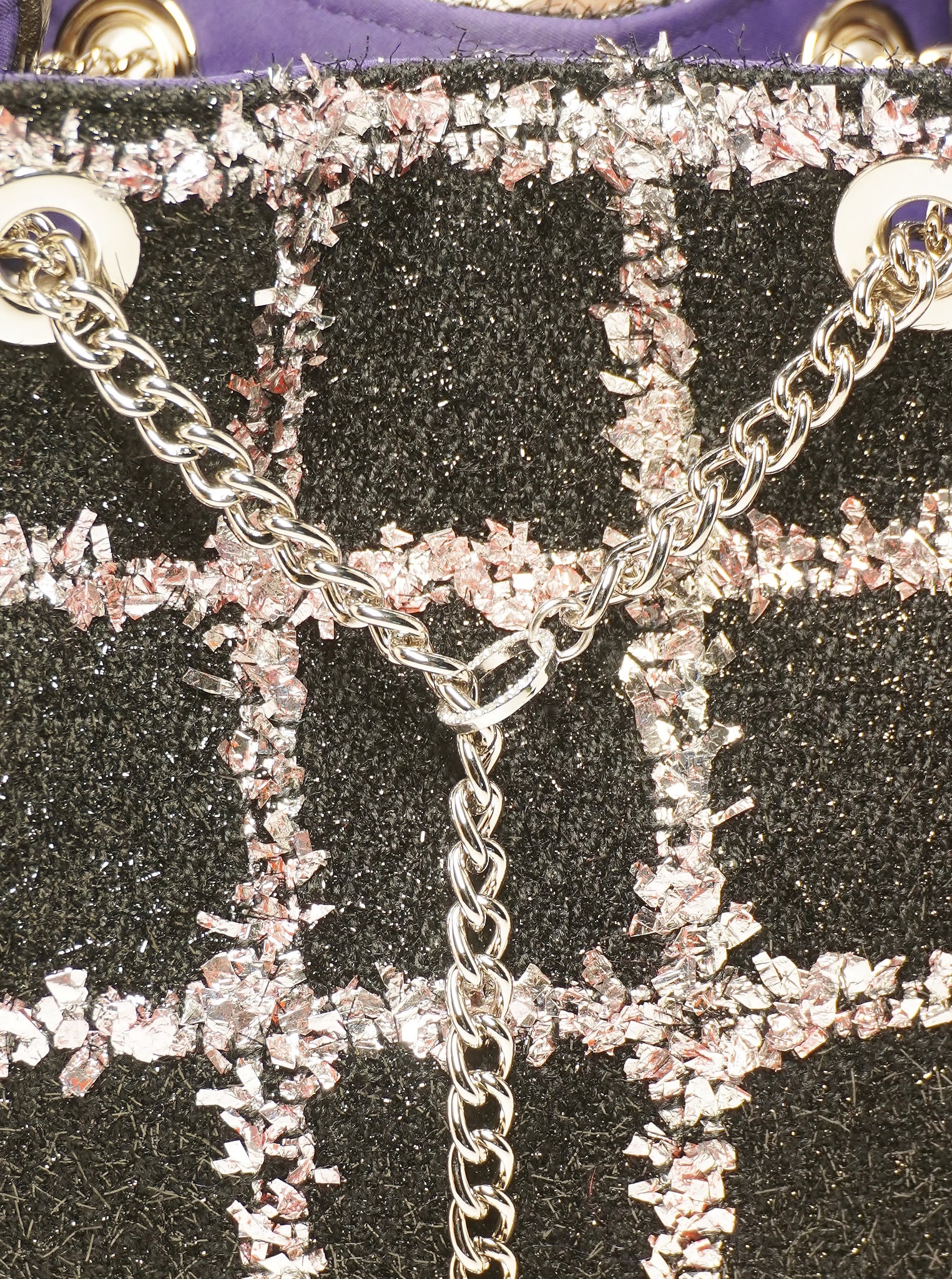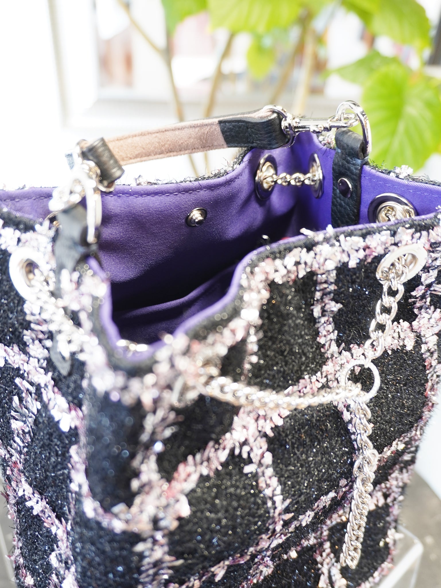 キラキラのメタリックブラックをベースに、ピンクシルバーの大胆な格子柄が映える、ゴージャスな「シャネル・ツイード」の手提げバッグ