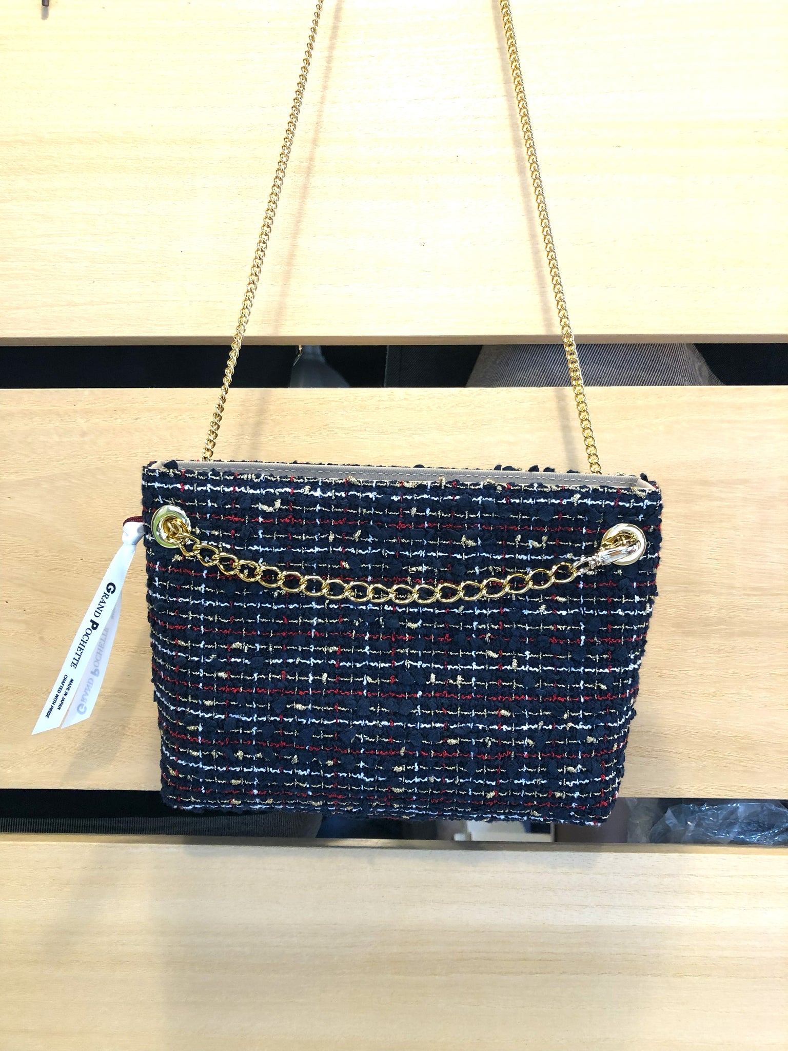 ゴールドのきらめきと、立体感のある糸の表情の豊かさ!トラッドなテイストの中に華やかさが匂い立つ、ウベルティーノのクチュールツイードのグラン・ポシェット