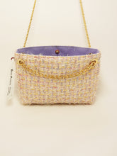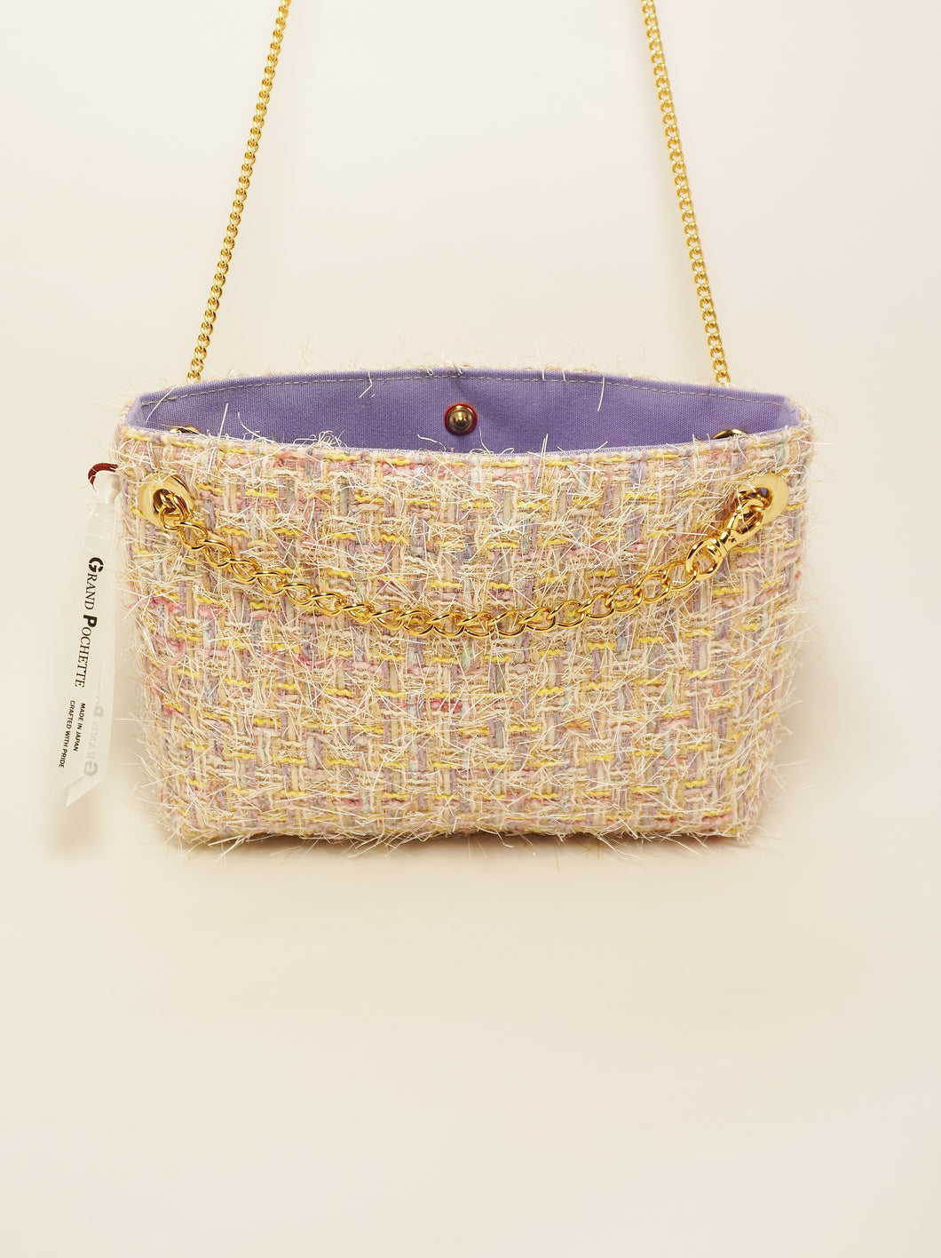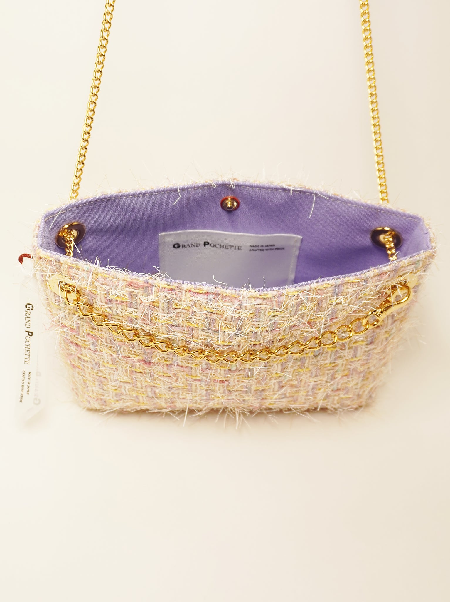 透明感のあるヤーンが繊細にきらめき、ふんだんにあしらわれたアイラッシュヤーンが全体を包みこむ、夢見るようなパステルカラーの「シャネル・ツイード」のグラン・ポシェット